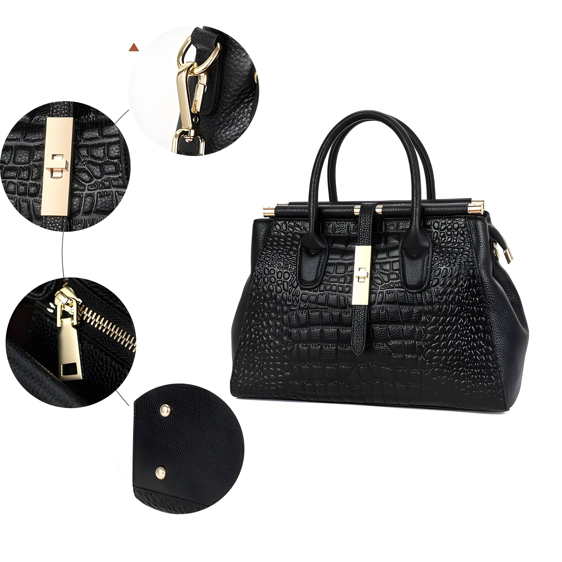 Elegance meets sophistication in this beautifully crafted handbag, featuring a luxurious embossed alligator print on premium vegan leather. The structured design is both modern and timeless, while the gilded magnetic snap closure provides a bold contrast against the sleek black finish, enhancing its chic appeal.