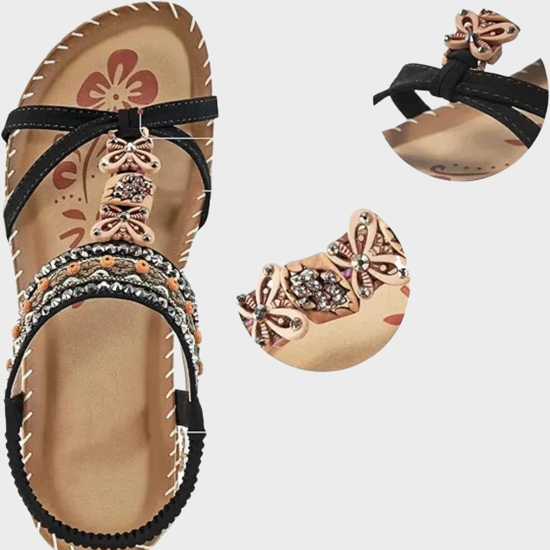 Make your steps a unique expression of style with the Ethnic Comfort Luxe Sandal. Inspired by boho elements and handcrafted details, it combines elegance and comfort in a versatile and charming design. The carefully crafted design with visible stitching and decorative applications adds personality to every detail – ideal for those who seek comfort without compromising on style.